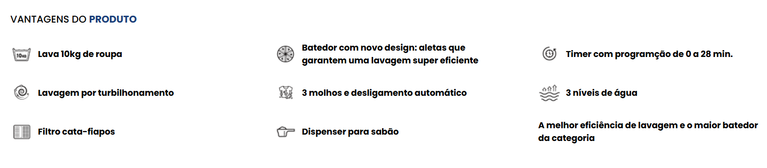 Conta com 6 programas de lavagem, ideais para diferentes tipos de tecido, e 3 níveis de água, evitando desperdícios. O filtro cata-fiapos ajuda a preservar as roupas por mais tempo, enquanto o big dispenser para sabão garante melhor dissolução do produto, evitando manchas e desperdício.