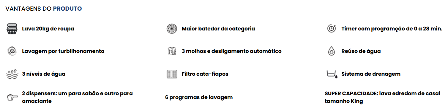 Conta com 6 programas de lavagem, ideais para diferentes tipos de tecido, e 3 níveis de água, evitando desperdícios. O filtro cata-fiapos ajuda a preservar as roupas por mais tempo, enquanto o big dispenser para sabão garante melhor dissolução do produto, evitando manchas e desperdício.