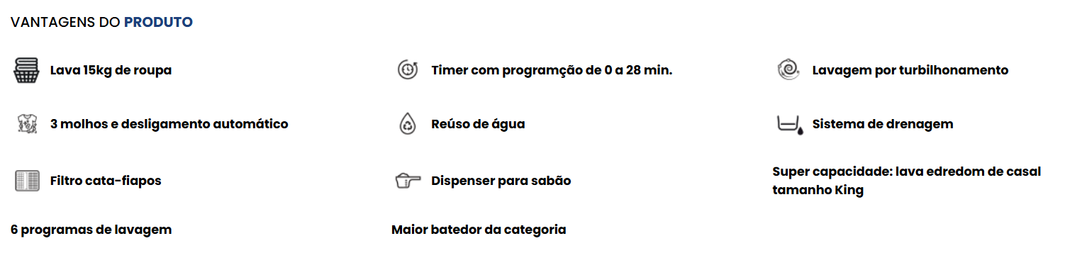 Conta com 6 programas de lavagem, ideais para diferentes tipos de tecido, e 3 níveis de água, evitando desperdícios. O filtro cata-fiapos ajuda a preservar as roupas por mais tempo, enquanto o big dispenser para sabão garante melhor dissolução do produto, evitando manchas e desperdício.